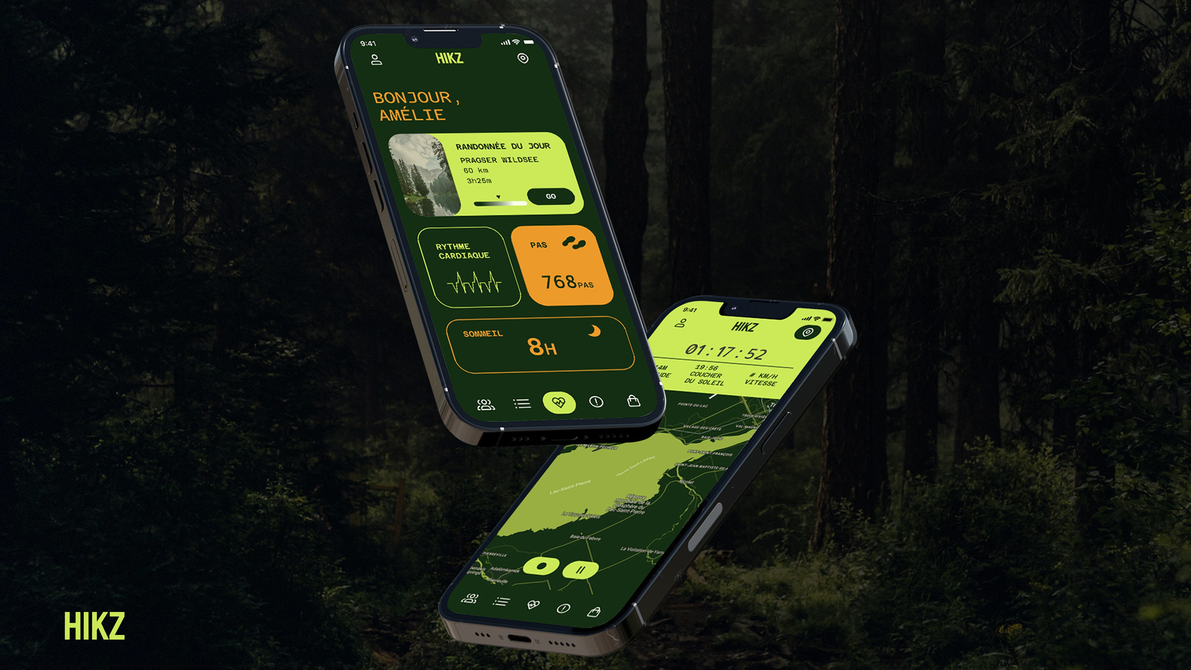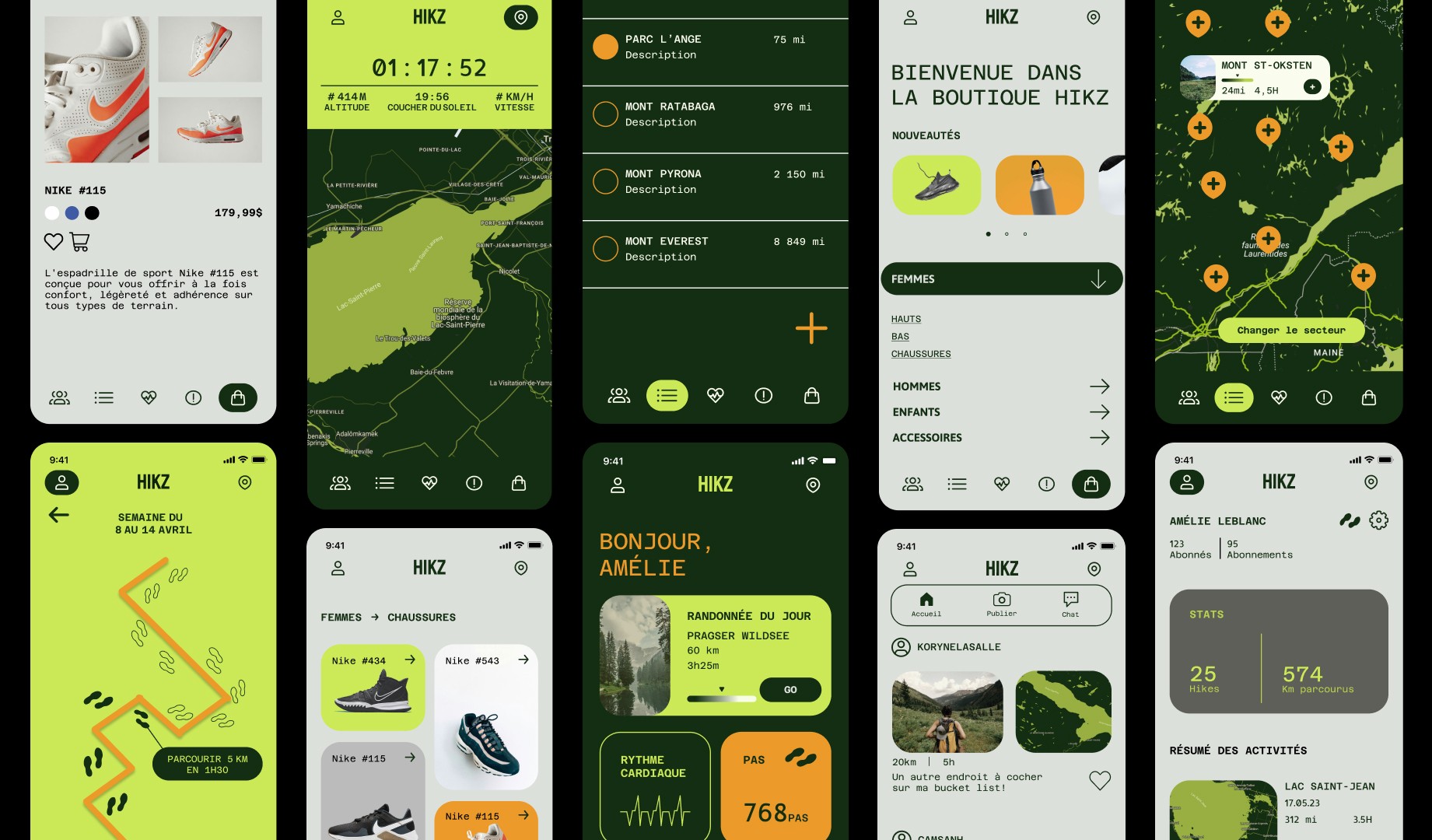 Le mandat était de concevoir une application centrée sur le bien-être et l’activité physique. Elle viserait à suivre les données de santé mais aussi à offrir des conseils personnalisés et des astuces pour adopter des habitudes saines adaptées selon une activité sportive spécifique. Cette application serait destinée à un large éventail d’utilisateurs actifs, des débutants aux athlètes de haut niveau. L’application HIKZ est spécialisée en sport de randonnée. L’objectif de l’interface est d’offrir une expérience où l’utilisateur peut non seulement avoir accès à ses données de santé et l’évolution de sa performance, mais aussi trouver de nouveaux sentiers à parcourir, pouvoir créer une liste de souhaits, interagir avec d’autres utilisateurs, magasiner à la boutique spécialisée, et plus encore !