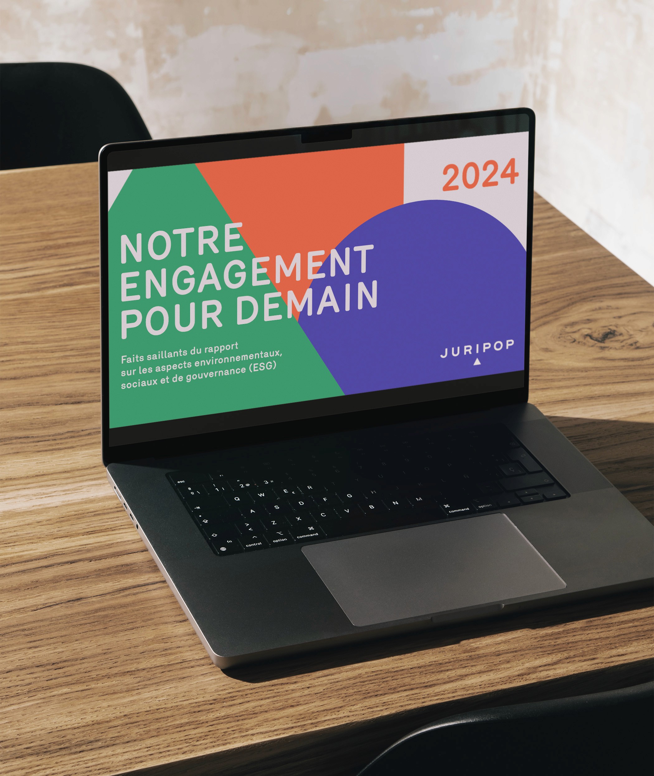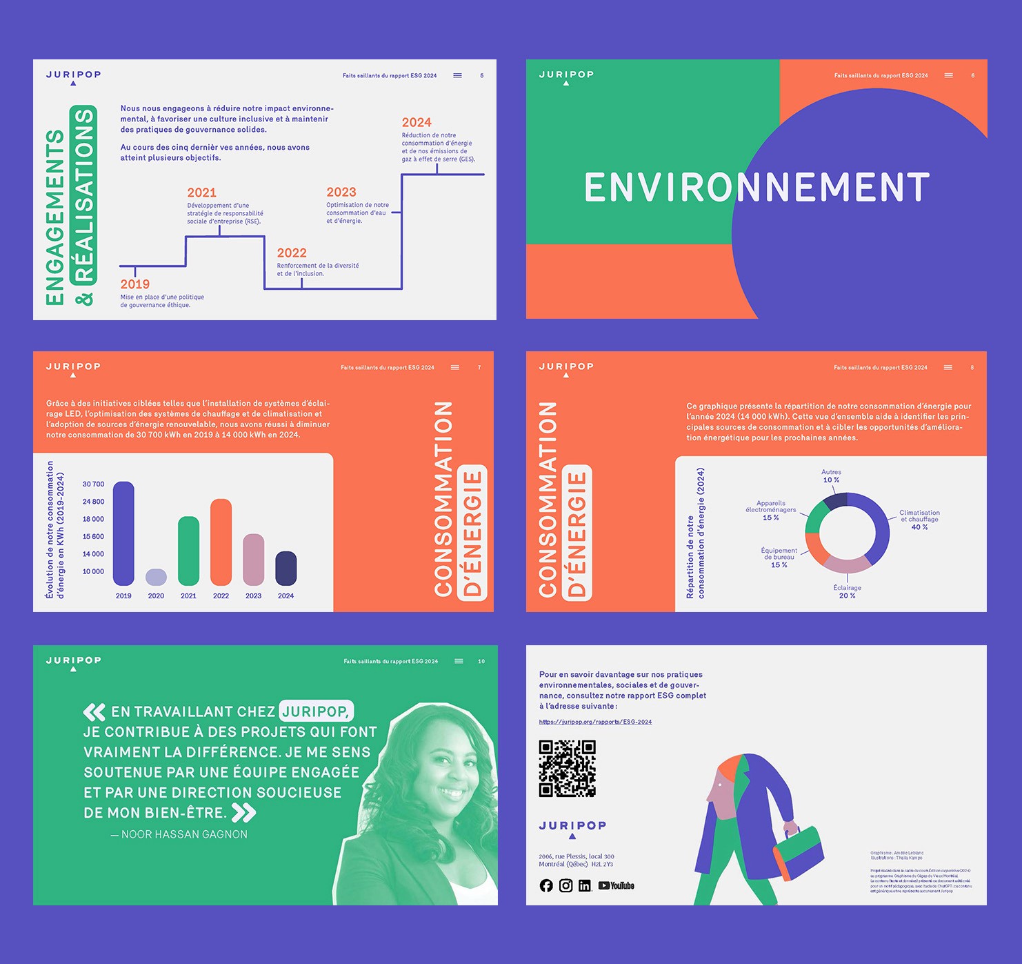 Le projet consistait à concevoir les pages clés d'un document de présentation pour l'entreprise Juripop mettant de l’avant les faits saillants de son rapport ESG 2024. L'ensemble du visuel devait refléter l'environnement graphique existant de la compagnie. Ce concept est basé sur les formes géométriques ainsi que sur les illustrations fournies par l'entreprise. Les couleurs varient d'une section à l'autre, créant du rythme et rendant la lecture plus agréable, tout en séparant clairement les différents sujets.