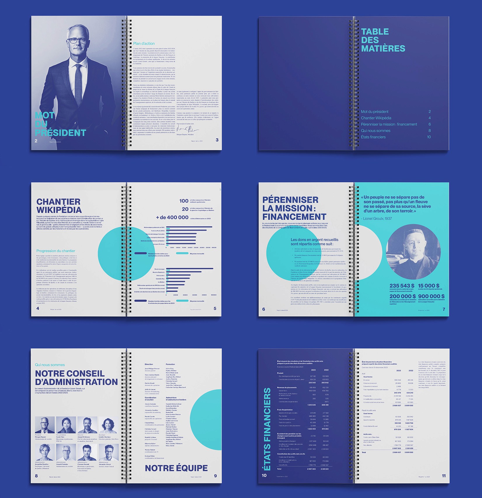 Dans le cadre d’un cours d’édition corporative, le travail consistait à réaliser les pages clés du rapport annuel 2023 de la Fondation Lionel-Groulx. Les couleurs contrastées créent un visuel cohérent et percutant. Les cercles, intégrés comme éléments graphiques, font un clin d’œil aux points de suspension, symbole important de l’identité visuelle de la fondation. Ce concept permet une lecture dynamique et reste représentatif de l’image de la fondation.