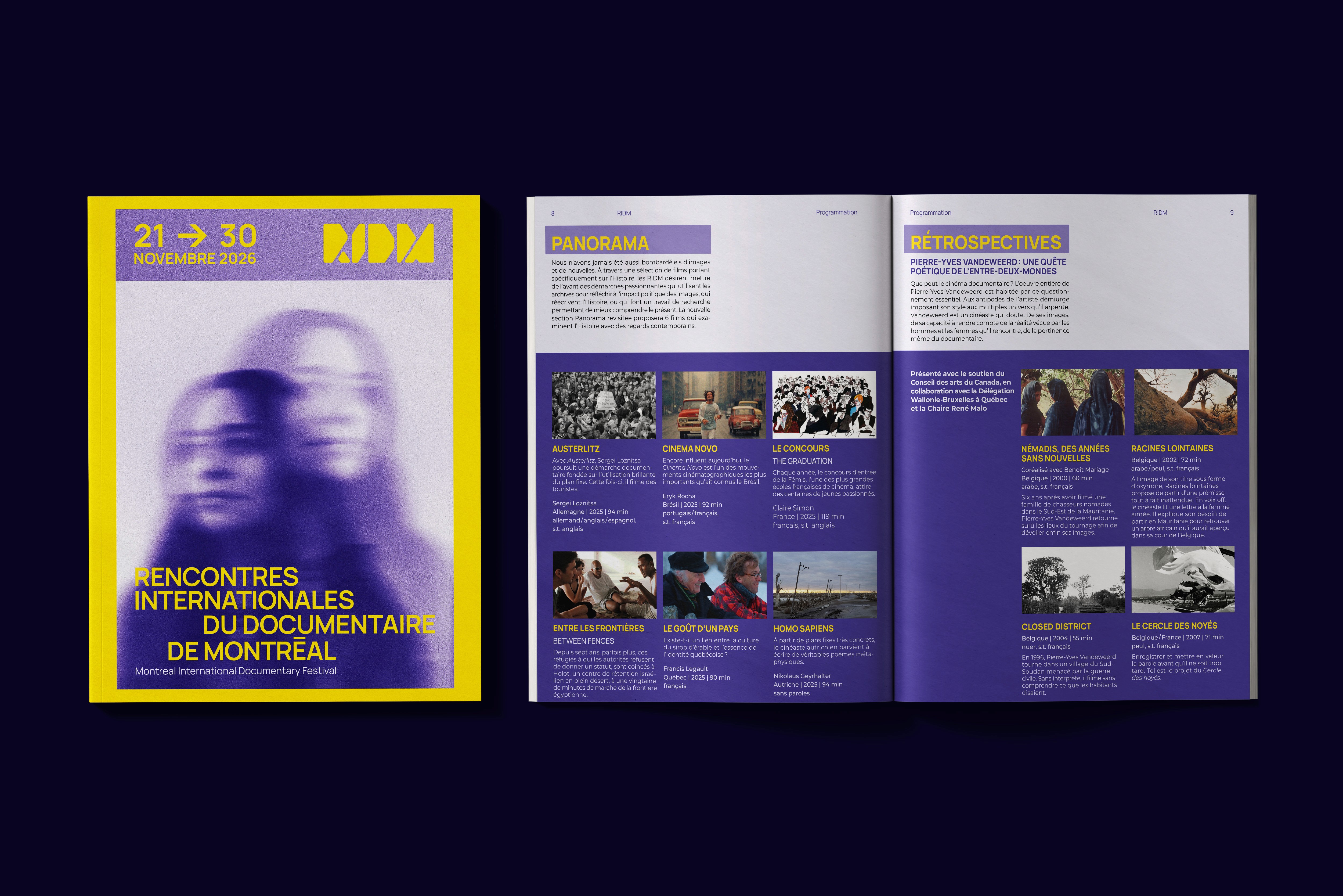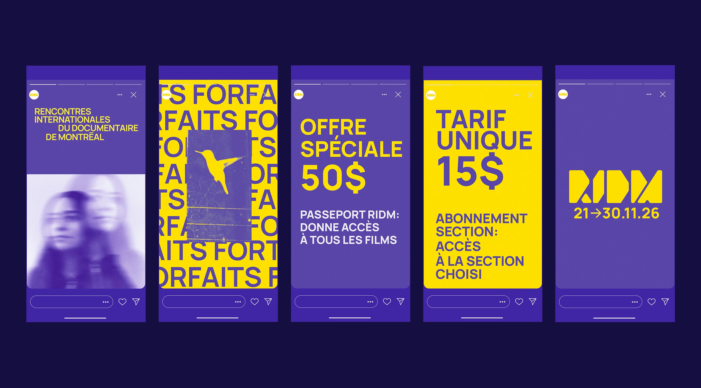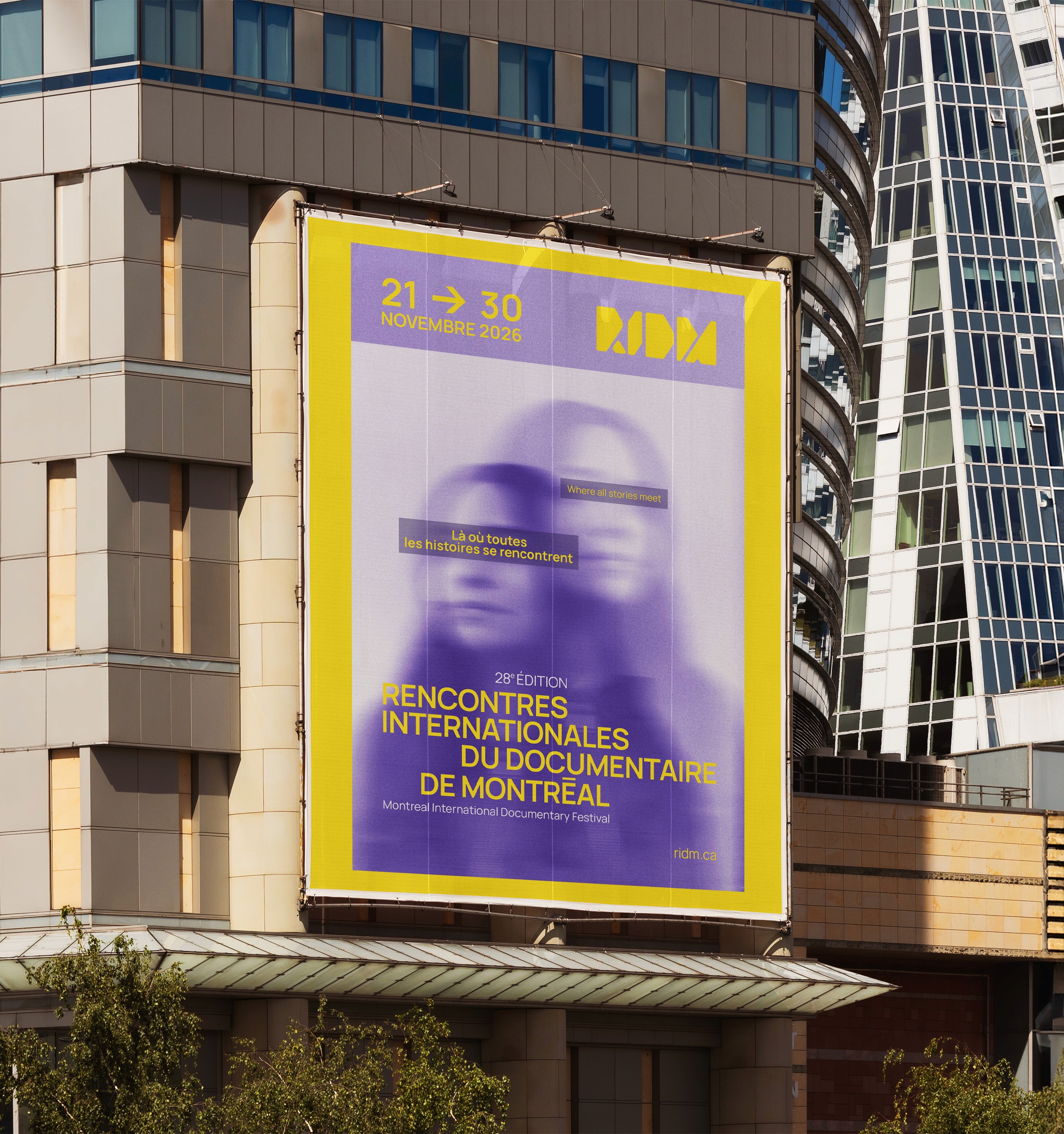 Pour la 28e édition du festival RIDM, le mandat était de concevoir une campagne publicitaire qui mettrait en valeur le cinéma indépendant ainsi que le documentaire engagé. Le concept met de l’avant l’idée du mouvement et des changements que tentent d’apporter ces films dans notre société. Les bandes sur les yeux, agissant comme des sous-titres, représentent l’ouverture sur le monde et les nouvelles perspectives.